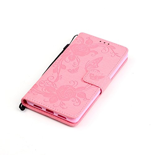 ISAKEN Compatibile con Huawei P9 Lite Custodia [PU Pelle]con Strap, Bookstyle Fiori Design Custodia in Pelle PU Portafoglio Wallet Cover con Supporto di Stand/Carte Slot - Farfalla Fiori: Rosa