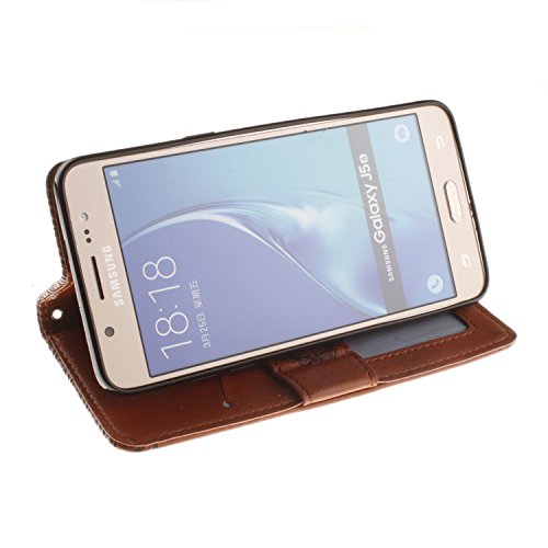 ISAKEN Compatibile con Samsung Galaxy J5 2016 Cover [PU Pelle] [Shock-Absorption] Portafoglio Custodia, Fiori Design Libro Wallet Flip Case Copertura con Strap/Supporto di Stand/Carte Slot -Marrone