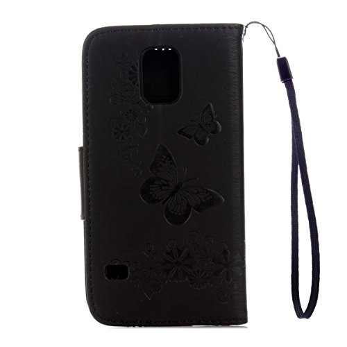 ISAKEN Compatibile con Samsung Galaxy S5 Custodia, Libro Sbalzato Embossed Case Wallet Cover in Pelle PU Protettiva Flip Portafoglio Caso con Supporto di Stand/Carte Slot/Chiusura - Farfalla: Nero