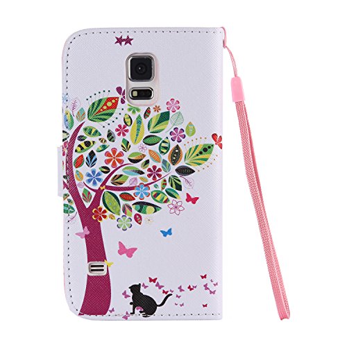 ISAKEN Compatibile con Samsung Galaxy S5 Custodia in Pelle PU Protettiva Flip Portafoglio Caso con Strap/Supporto di Stand/Carte Slot/Chiusura Magnetica - Cartoon Gatto