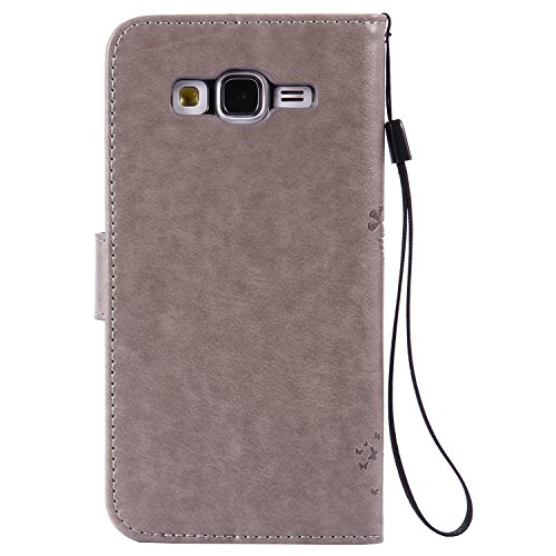 ISAKEN Compatibile con Samsung Galaxy Grand Prime G530 Custodia, Libro Flip Cover Portafoglio Wallet Case Albero Design in Pelle PU Protezione Caso con Supporto di Stand/Carte Slot/Chiusura - Grigio