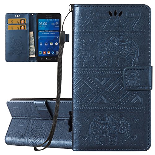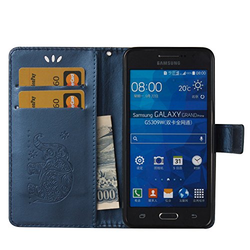 ISAKEN Cover Galaxy Grand Prime, Flip Cover Custodia con Strap per Samsung G530, Embossed PU Pelle Case Flip Portafoglio Cover Waller Caso con Supporto di Stand/Carte Slot - Elefante: Blu Scuro