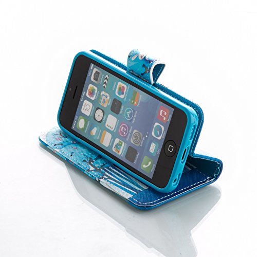 ISAKEN Custodia iPhone 5C, Cover iPhone 5C Flip Case, Elegante borsa Custodia in Pelle Protettiva Flip Portafoglio Case Cover per Apple iPhone 5C / con Supporto di Stand / Carte Slot / Chiusura Magnetica - forest coniglio gufi uccellini