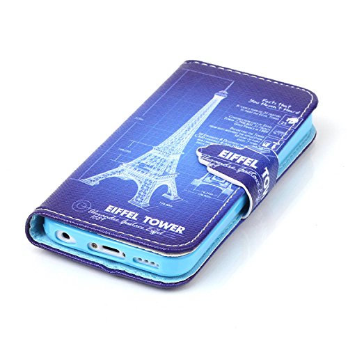 ISAKEN Custodia iPhone 5C, iPhone 5C Cover Case, Elegante borsa Custodia in Pelle Protettiva Flip Portafoglio Case Cover per Apple iPhone 5C / con Supporto di Stand / Carte Slot / Chiusura Magnetica (Torre Eiffel Blu)