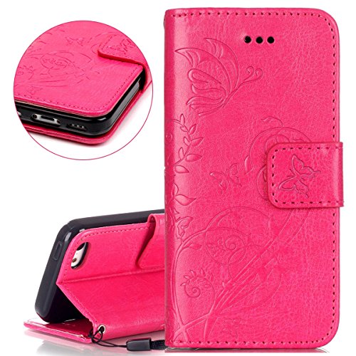 ISAKEN Custodia iPhone 5C, iPhone 5C Flip Cover Case, iPhone 5C Wallet Cover Fiori Design in Pelle PU Protettiva Flip Portafoglio Caso/con Supporto di Stand/Carte Slot/Chiusura -Flower: ROSEO