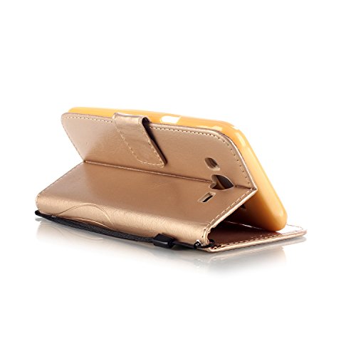 ISAKEN Custodia Samsung Galaxy J5 2015 Wallet Cover con Strap Fiori Design in Pelle PU Caover Flip Portafoglio Case per Galaxy J5 2015/ con Supporto di Stand/Carte Slot/Chiusura - Flower: Gold