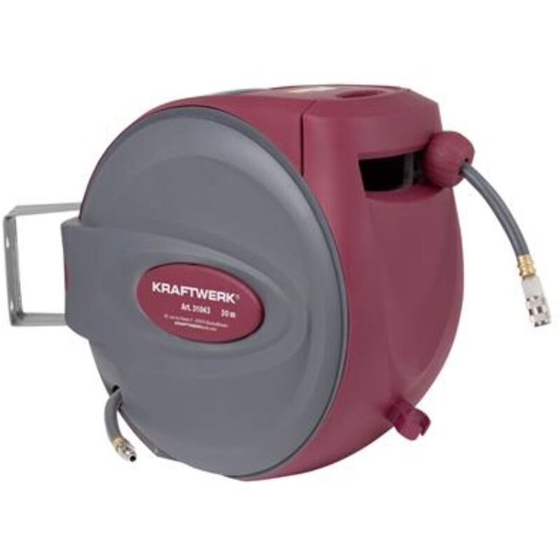 31043 rullo di tubi d'aria compressa automatica 30 + 2 m. L'alloggiamento è realizzato con polipropilene in plastica della luce ma robusta (PP). La staffa di assemblaggio può essere ruotata di 180 °. Il rullo del tubo è dotato di una molla di ritorno automatica e di una funzione di bacino idromassaggio rallentata. Il sistema di bloccaggio impedisce il ritorno indesiderato. Tusino rinforzato con polimero ibrido da 30 m per il lato di connessione, funzione di bacino del tubo rallentato