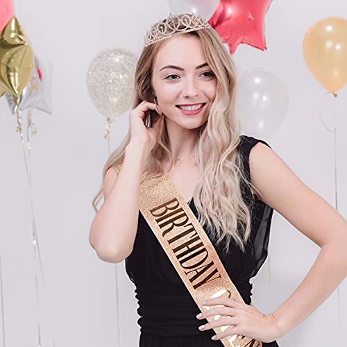 ISIYINER Compleanno Corona Tiara e Sash, Strass Corona Diadema con Satin Sash Compleanno Copricapo Decorazioni per Ragazze Donna Feste di Compleanno (Oro rosa)