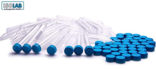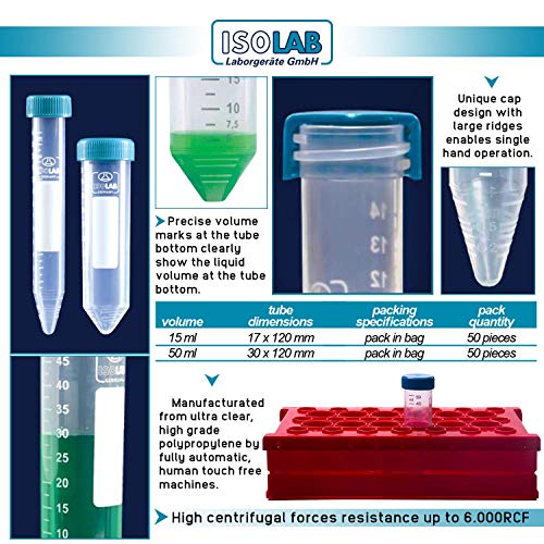 ISOLAB USA - Tubi centrifuga in plastica, 15 ml, fondo conico - tappi a vite blu, segni graduati, non sterili, confezione da 50 pezzi (50, 15 ml - 50 pezzi)