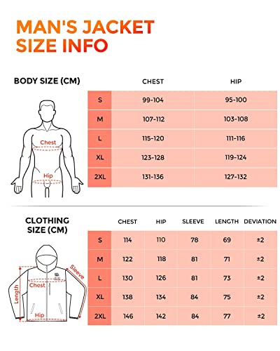 【4 zone di riscaldamento】 Le giacche riscaldate da uomo hanno 4 elementi riscaldanti, che generano calore sulla scollatura (1), sul petto (2) e sulla schiena (1) per mantenerti caldo e comodo. Note: si consigliamo di scegliere una taglia una taglia più piccola del solito.