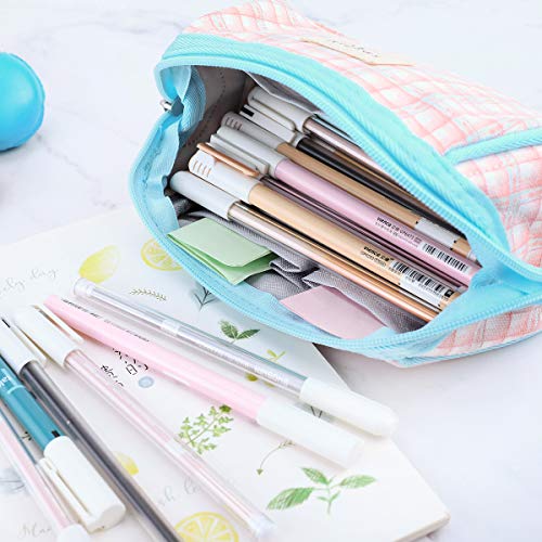 ISuperb Astuccio Portapenne Strisce Matite Borsa di Cancelleria Trapezoidale Penna Caso da Custodia Organizzatore Pencil Case Grande Capacità Tela Sacchetto Pencil Case (Plaid blu rosa)