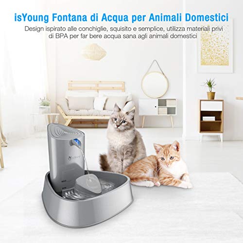 【SILENZIOSO E BASSO CONSUMO DI ENERGIA】 L'erogatore di acqua per animali domestici isYoung Noise Cancelling non influenzerà il tuo animale domestico e il sonno. Consuma solo circa 1,5 kWh al mese, 18 kWh all'anno.