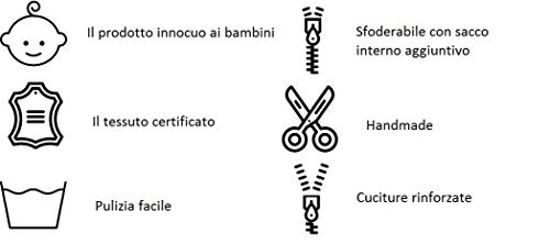 Pouf sacco è SFODERABILE- possiede all'interno un sacco aggiuntivo in tessuto non tessuto TRASPIRANTE che racchiude il riempimento. Il sacco interno è dotato di una cerniera, quindi è possibile aggiungere o sostituire il riempimento in modo veloce e facile. Pouf a Sacco possiede DOPPIA CERNIERA - il riempimento non esce mai fuori involontariamente. Pouf, inoltre, possiede cuciture RINFORZATE che rendono il prodotto molto resistente e duraturo. Pouf sacco possiede una comoda maniglia.