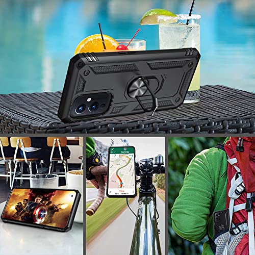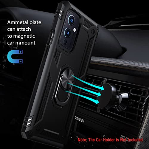 IVoler Cover per Oneplus 9 con 3 Pezzi Pellicola Vetro Temperato, Grado Militare Custodia Protezione con Anello Ruotabile Cavalletto, Antiurto TPU Bumper Case - Nero