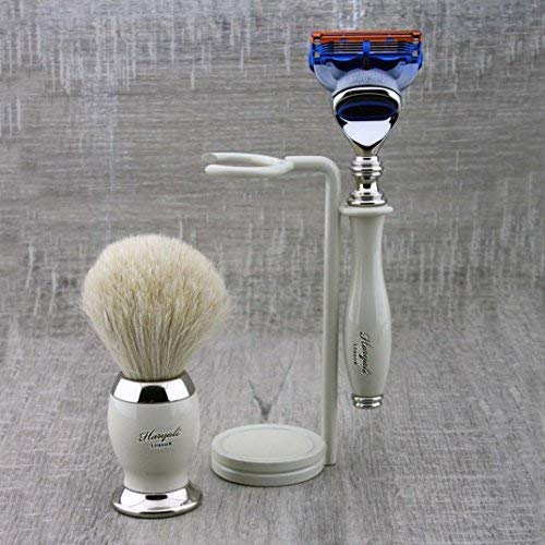 Ivory Color - Set da barba tradizionale da uomo, 3 pezzi, bianco puro, pennello da barba, rasoio, pennello da barba per rasoio e pennello perfetto per rasatura a umido