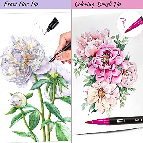⭐ 【Design a doppia punta】 36 pennarelli colorati con due tipi di punte: Finliner e Brush. Fineliner da 0,4 mm per delineare, pennarello da 1-2 mm per sfumare e colorare. Puoi anche creare tratti e stili diversi variando la pressione del pennello.