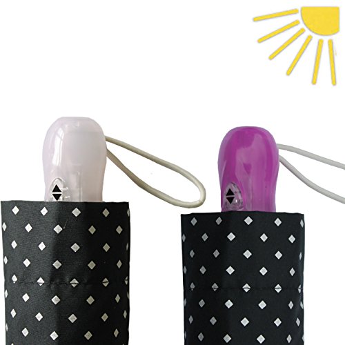 Il manico bianco dell'ombrello tascabile e la parte superiore bianca cambiano colore da bianco a viola. Un divertente gimmick quando viene utilizzato come ombrellone.
