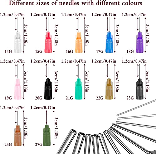 Facile da Distinguere - 12 diverse misure hanno colori diversi, verde, arancione, marrone, grigio, azzurro, nero, rosa, viola, blu, giallo, rosa rossa, bianco, che possono distinguere rapidamente e chiaramente gli aghi per flacone contagocce ed evitare confusione, è molto conveniente, risparmiare tempo e migliorare l'efficienza.