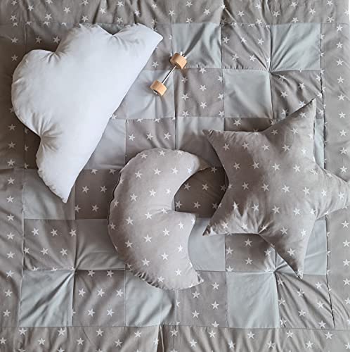 3 cuscini: nuvola, stella, luna. Imbottitura in silicone anallergico. Certificazione Oeko-Tex Standard 100. Cuscino: grigio, bianco
