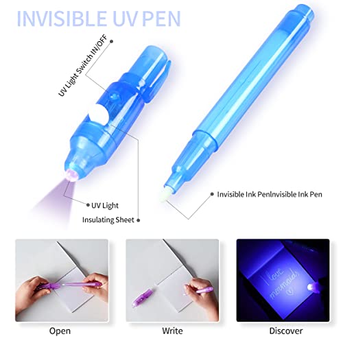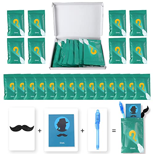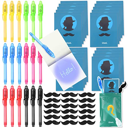 IZoeL 18 Penne Penna Inchiostro Invisibile Segreta con Lampada UV 18 Quaderni 18 Baffi 18 Borse Feste, Gioco Spionaggio Invisibile per Scrittura Feste, Gioco Detective, Pacchetto Riempimento Feste