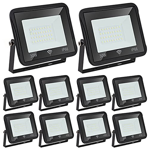 Izrielar 10 faretti per esterni con rilevatore di movimento, proiettore Faretto a LED IP66 impermeabile, 30W 2550LM super luminoso 3000K bianco luce diurna, illuminazione esterna bianca calda