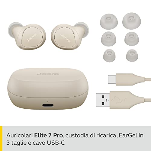 Nella confezione: 1x Jabra Elite 7 Pro Auricolari Bluetooth Wireless In Ear, custodia di ricarica, EarGel in 3 misure, cavo USB-C, Peso: 5,4 g, Colore: beige oro. Confezione facile da aprire