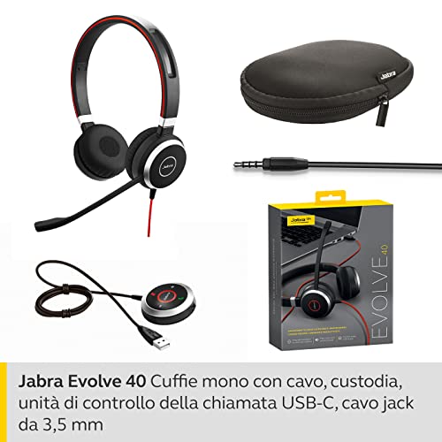 Consegna: Jabra Evolve 40 Cuffie Stereo On - Ear - Cavo USB con unità di controllo - Jack di 3,5 mm - Custodia protettiva in neoprene - Peso: 171g - Nero