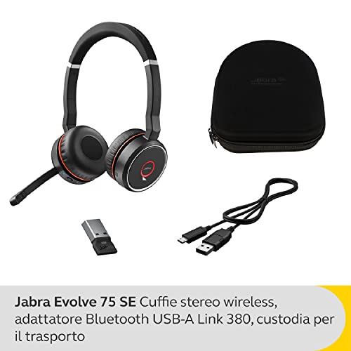 Nella confezione: Jabra Evolve 75 SE Cuffie Stereo wireless con adattatore Link 380 USB-A, cavo USB di ricarica, custodia da viaggio e opuscolo di sicurezza - Peso delle cuffie: 177 g - Colore: nero