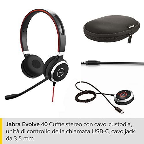 Consegna: Jabra Evolve 40 MS Cuffie Stereo On-Ear Cavo USB-C con unità di controllo, jack di 3,5 mm, custodia protettiva in neoprene Peso: 142g nero