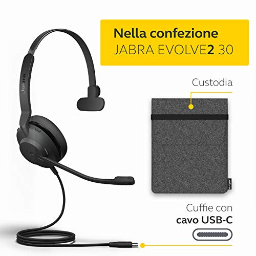 Contenuto della spedizione: cuffie mono Jabra Evolve2 30, cavo USB-C, custodia morbida, Peso delle cuffie: 142g, Colore: nero
