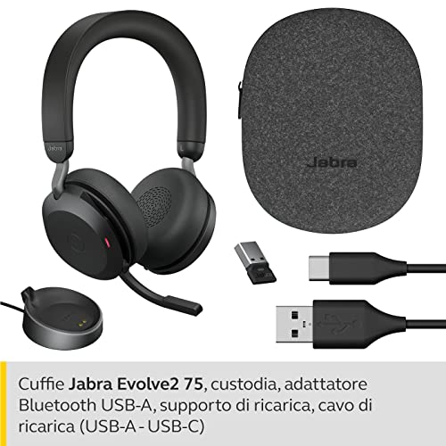 Nella confezione: 1 x Cuffie Jabra Evolve2 75 con Base di Ricarica, cavo USB-A, adattatore Bluetooth Link 380 USB-A, custodia, peso cuffie: 197 g, colore: nero;