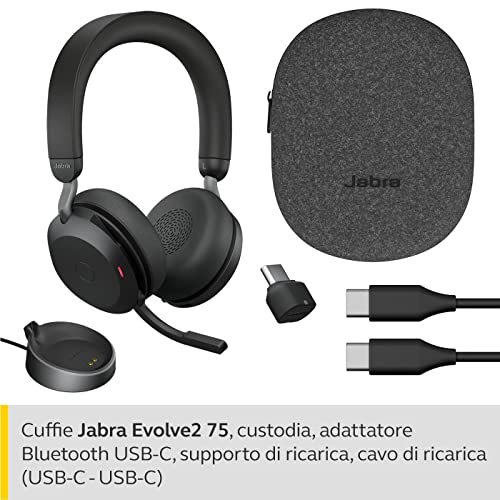Nella confezione: 1 x Cuffie Jabra Evolve2 75 con Base di Ricarica, cavo USB-C, adattatore Bluetooth Link 380 USB-C, custodia, peso cuffie: 197 g, colore: nero - Confezione sostenibile e riciclabile