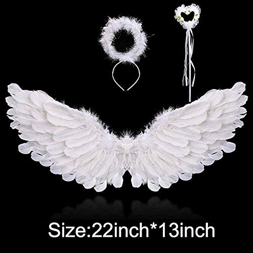 Jackcell Costume da ali d'angelo, piume con lureola e bacchetta magica per Halloween, carnevale, cosplay, feste di carnevale (bianco, piccolo)