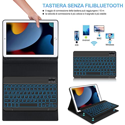 Tastiera Retroilluminata per iPad 9a Gen: Design della tastiera bluetooth wireless magnetica staccabile, facile da rimuovere la tastiera sempre e ovunque, utilizzando la più recente tecnologia bluetooth per una connessione veloce e stabile. Sensazione di digitazione piacevole e battiture silenziose. Tre regolazioni della luminosità e sette colori di retroilluminazione rendono la digitazione più divertente.