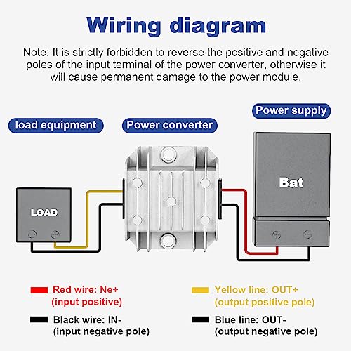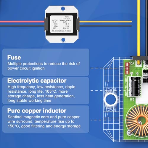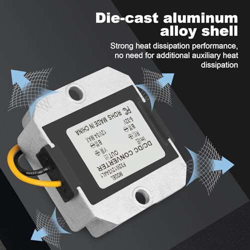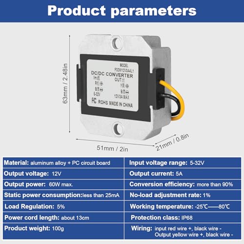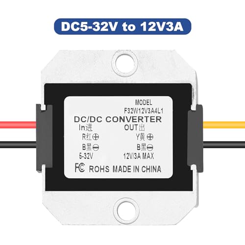 【Facile da Usare】La lunghezza della linea è di circa 12 cm, con una struttura sottile, un volume ridotto e un'installazione conveniente. Convertitore step-down da DC 24V a DC 12V. Ingresso ad ampio raggio 5-32V. Corrente massima 3A 60W.