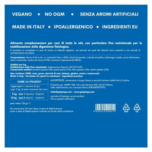 JAMPY Integratore Cane Prebiotici, Fermenti Lattici, Probiotici in Polvere. Sostegno per l'Apparato Digerente, Ripristina la Flora Batterica - Alta Appetibilità - Formula Vegetale.