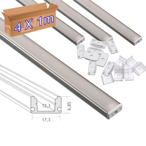 JANDEI - 4 x Profili in Alluminio Lunghi 1M per l'installazione Superficiale di Strisce Luminose a LED, con Diffusore Traslucido. Include Tappi Terminali e Accessori (17,3mm x 6,85mm)