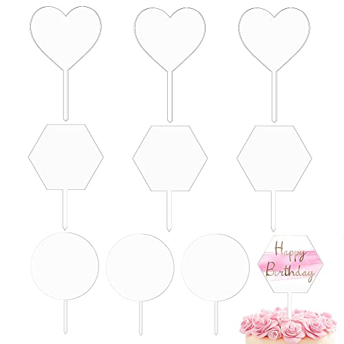 JaneYi 9 pezzi Topper per Torta in Acrilico Vuoto Cake Topper Trasparente 10cm Forma di Cuore Esagonale Cerchio Topper per Torte DIY per Battesimo Compleanno Matrimonio Anniversario Festa