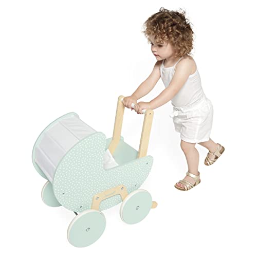 COMPLETA - Dotata di una cappottina in tessuto (non removibile), questa carrozzina per bambole e peluche (fino a 42 cm, non inclusi) sui toni del verde e del bianco include una copertina e un cuscino per il massimo comfort.