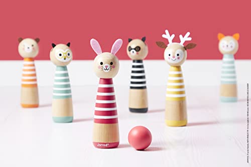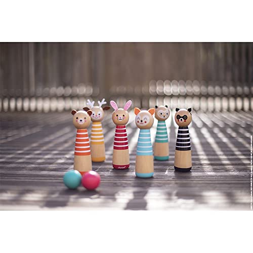 GIOCO DI ABILITÀ IN LEGNO: Un gioco di abilità in 100% legno composto da 6 graziosi birilli decorati con piccole teste rotonde di animali divertenti (procione, coniglio, volpe, gufo, orso e cervo) e 2 sfere di legno (verde e rosso). Il gioco ideale per sviluppare la motricità fine e la concentrazione del tuo bambino.