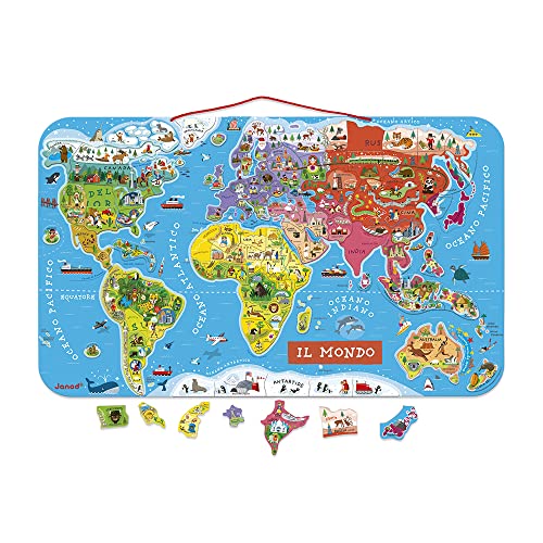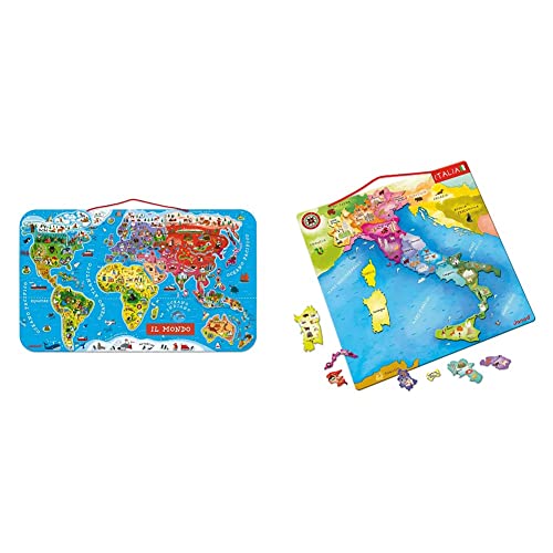 JANOD- Puzzle Magnetico Carta del Mondo in Legno, Planisfero Murale con 92 Pezzi Calamitati & Cartina Dell'Italia Magnetica - Puzzle Bambino in Legno - 20 Pezzi Magnetici