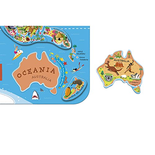 PUZZLE CARTA DEL MONDO: ogni calamita corrisponde a un paese o una zona del mondo, con il suo nome, la sua capitale e un'illustrazione caratteristica di quella parte del globo;