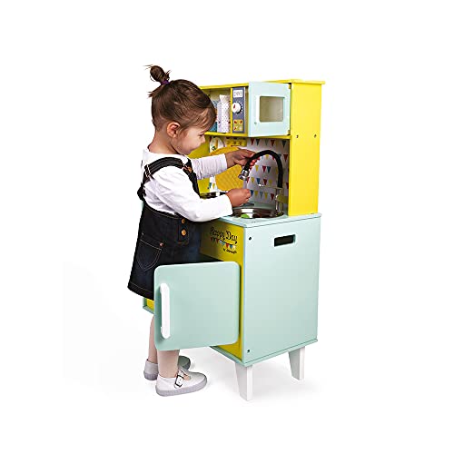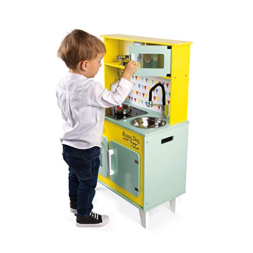 Janod - Big Wooden Play Kitchen - Happy Day - With Fridge and Microwave Oven, Sound and Light - Pretend Play Toy Kitchen - 7 Accessories Included - From 3 Years Old, J06564
