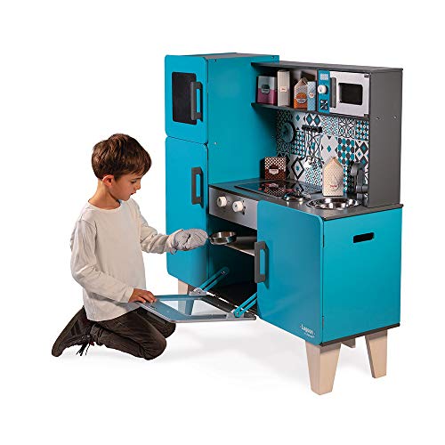 Janod - Wooden Play Kitchen Lagoon Maxi with Fridge and Microwave Oven - Pretend Play Toy Kitchen - 15 Accessories Included - From 3 Years Old, J06555