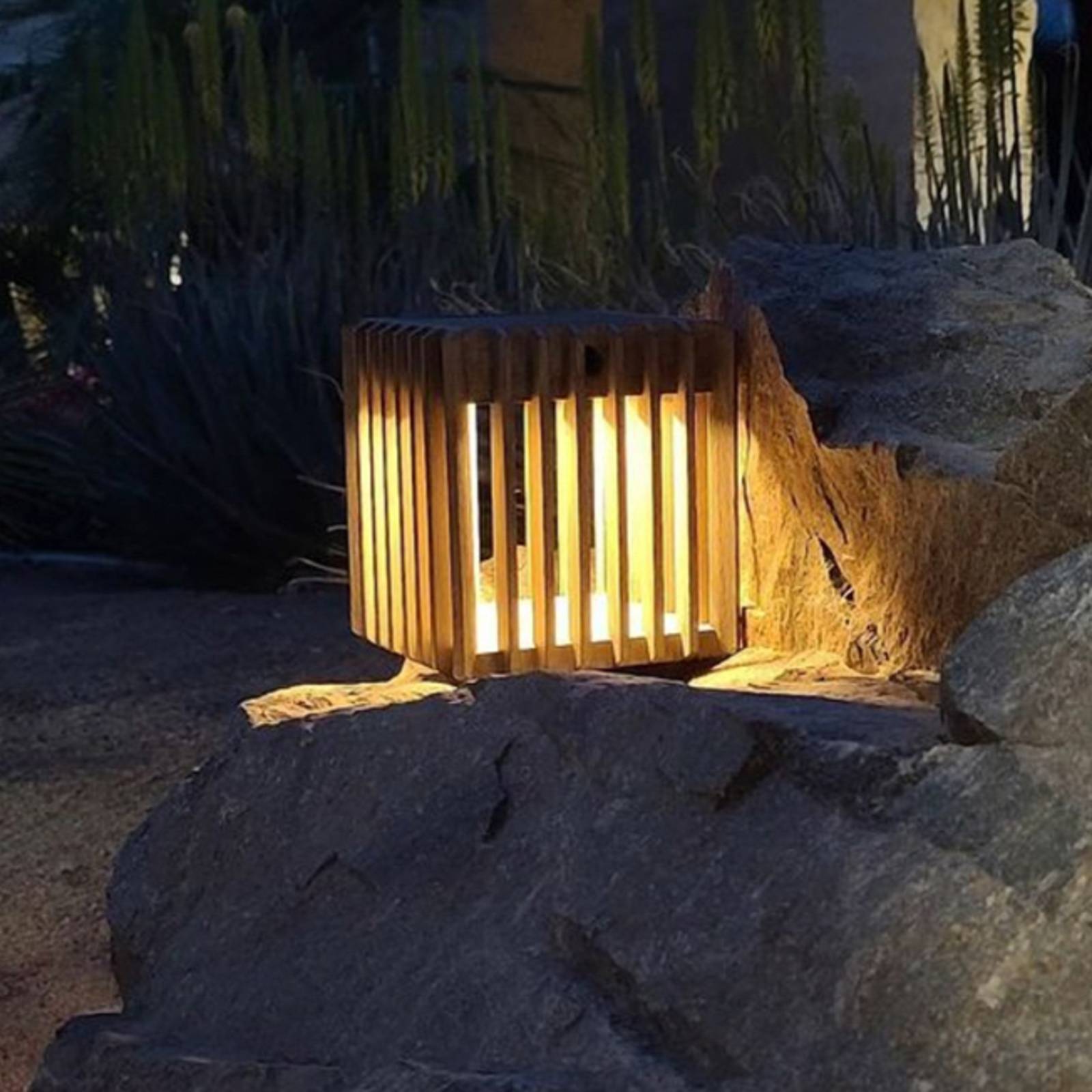 Lampada da tavolo solare Verti LED a forma di cubo in legno di teak La lampada da tavolo solare Verti LED ha una forma angolare ed è realizzata in legno di teak. È composta da numerosi montanti attraverso i quali la luce dei LED di colore bianco caldo si diffonde, creando un motivo d'atmosfera. Grazie alle sue dimensioni compatte e all'uso autonomo, può essere collocata su qualsiasi tavolo e può essere utilizzata in modo flessibile anche all'esterno. Tramite il modulo solare integrato è possibile selezionare due diverse modalità: nella prima, il sistema monitora costantemente tre parametri: il consumo di energia, la riserva di energia e il tempo di buio. La luminosità della luce viene quindi regolata di conseguenza, in modo che la luce possa funzionare per tutta la notte. All'inizio del periodo di buio e alla fine della notte viene fornita una maggiore luminosità. Nella seconda modalità, la luce rimane accesa in modo permanente alla massima potenza luminosa. L'intensità della luce può essere regolata individualmente tenendo premuto il pulsante di accensione/spegnimento - Durata della luce compresa tra 4 e 150 ore