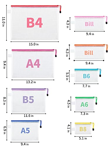 18 sacchetti con cerniera: la confezione include 18 sacchetti in rete con cerniera in 8 misure. Sono 2 x B4 (38 x 28 cm), 2 x A4 (33 x 23 cm), 2 x B5 (20 x 20 cm), 2 x A5 (24 x 15 cm), 2 x B6 (19 x 13 cm), 2 x A6 (19 x 13 cm), 2 x A6 (19 x 13 cm), 2 x A6 (19 x 13 cm). 7,3 × 4012,7 cm), 4 banconote (9,4 x 4,7,6 cm), 2 x B8 (5,1 x 4,2,5 cm).