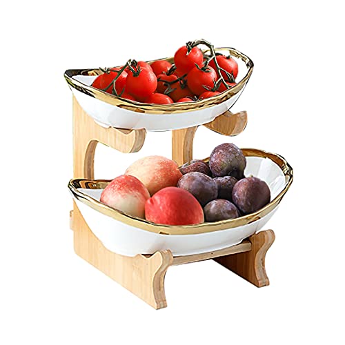JasCherry Fruttiera in Ceramica a 2 Livelli, Portafrutta Ovale con Cornice in legno, Piatti da Frutta in Ceramica per Frutta Verdura Dessert Candy, Decorazioni da Tavola, (20 x 20 x 21 cm)