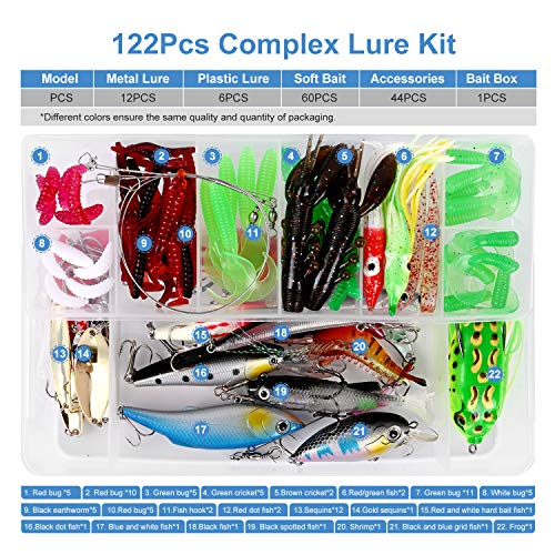 JasCherry 122 Pezzi/Set di Esche Miste, Kit Esche da Pesca Miste Minnow Popper VIB Matita Kit Esca Morbida e Dura Soft-Hard Bait Acqua Dolce/Salata con Scatola da Pesca#1
