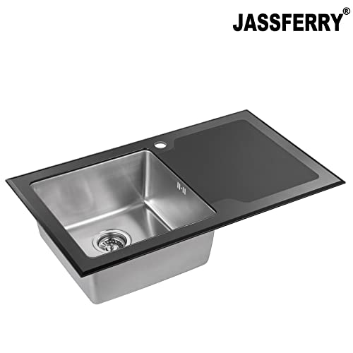 JASSFERRY Lavello da cucina Vasca singola in Acciaio Inox, scolapiatti a destra Lavandino, con piano in vetro nero lucido