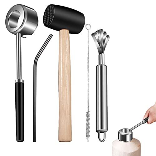 ➩Materiale durevole: il set di attrezzi per apri le noci di cocco è realizzato in acciaio inossidabile per uso alimentare che resiste alla corrosione e all'usura. Un martello di gomma con manico in legno evita il suono metallico aspro.